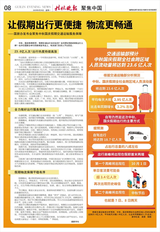 民航客运方面,为迎接国庆假期出行高峰,桂林机场协调多家航空公司恢复、加密航线航班,并通过更换宽体机等方式提升运力和服务体验,全力满足旅客出行需求。
