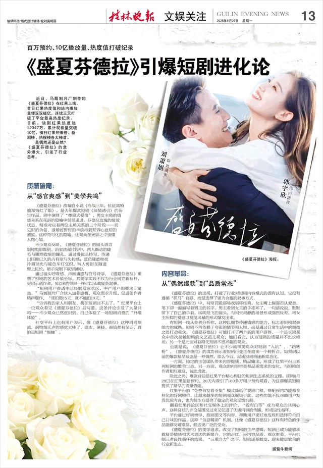《盛夏芬德拉》的美学追求,改变了短剧的生产逻辑,短剧已成为能够承载复杂情感和艺术表达的新媒介。它的走红,是内容品质、观众审美、平台机制三者良性循环的结果。“三重合力”之下,短剧逐渐蜕变,迎来健康繁荣的行业新生态。