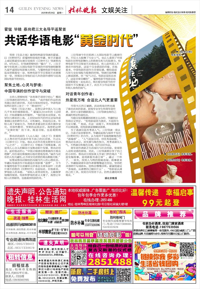霍猛 毕赣 蔡尚君三大名导平遥聚首 共话华语电影“黄金时代”   凭借《生息之地》摘得柏林最佳导演的霍猛、以《狂野时代》获戛纳特别奖的毕赣、将辛芷蕾送上威尼斯最佳女演员宝座的《日掛中天》导演蔡尚君,9月25日,在导演贾樟柯的“撮合”下,三位手握今年欧洲三大国际电影节荣誉的中国导演相聚第九届平遥国际电影展大师班,与戛纳电影节电影总监克里斯提安·琼、柏林电影节节目策划王庆锵围坐一堂,同观众分享他们近几年的创作感悟与征战国际电影节的经历。