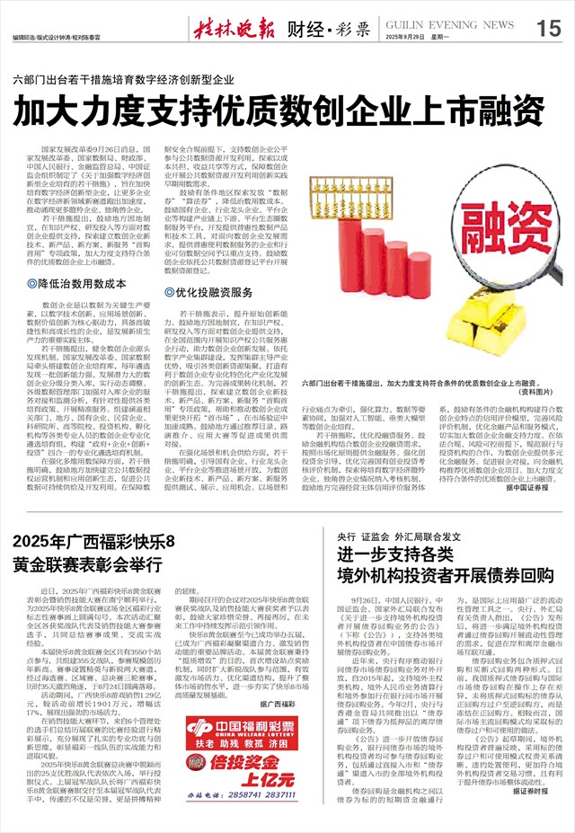 六部门出台若干措施培育数字经济创新型企业 加大力度支持优质数创企业上市融资   国家发展改革委9月26日消息,国家发展改革委、国家数据局、财政部、中国人民银行、金融监管总局、中国证监会组织制定了《关于加强数字经济创新型企业培育的若干措施》,旨在加快培育数字经济创新型企业,让更多企业在数字经济新领域新赛道跑出加速度,推动涌现更多瞪羚企业、独角兽企业。