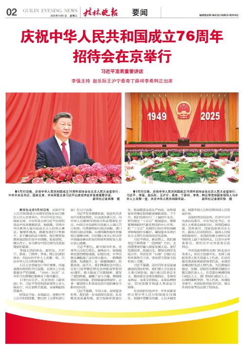 习近平指出,新中国76年来,党领导人民自力更生、接续奋斗,取得彪炳史册的辉煌成就。回望历史,中华民族从濒临危亡走向伟大复兴,一路筚路蓝缕、充满艰辛,也一路豪情满怀、凯歌高奏。前不久,我们隆重纪念中国人民抗日战争暨世界反法西斯战争胜利80周年,极大振奋了民族精神、激发了爱国热情、凝聚了奋斗力量。要继续用好历史经验,把国家建设得更好,让老一辈领导人和革命先烈开创的事业不断欣欣向荣。