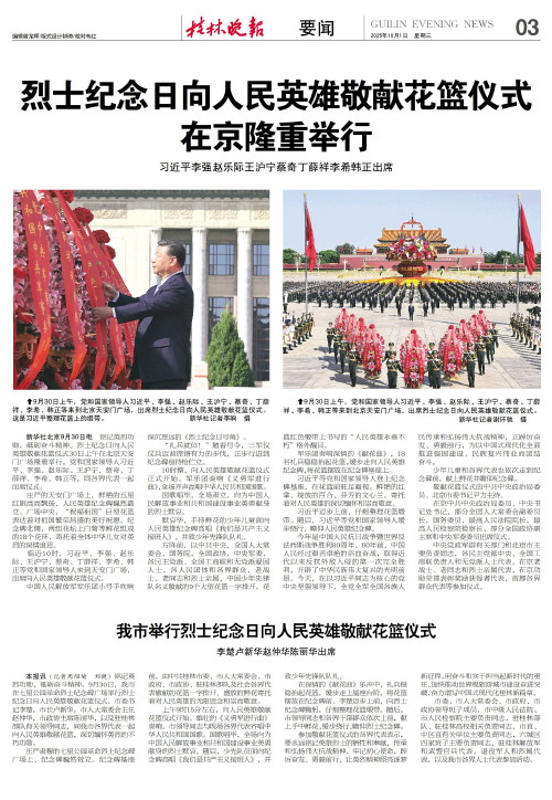 我市举行烈士纪念日向人民英雄敬献花篮仪式 李楚卢新华赵仲华陈丽华出席   本报讯(记者周绍瑜 刘健)铭记英烈功勋,砥砺奋斗精神。9月30日,我市在七星公园革命烈士纪念碑广场举行烈士纪念日向人民英雄敬献花篮仪式。市委书记李楚,市长卢新华,市人大常委会主任赵仲华,市政协主席陈丽华,以及驻桂林部队有关领导同志,同我市各界代表一起向人民英雄敬献花篮,深切缅怀英烈的不朽功勋。