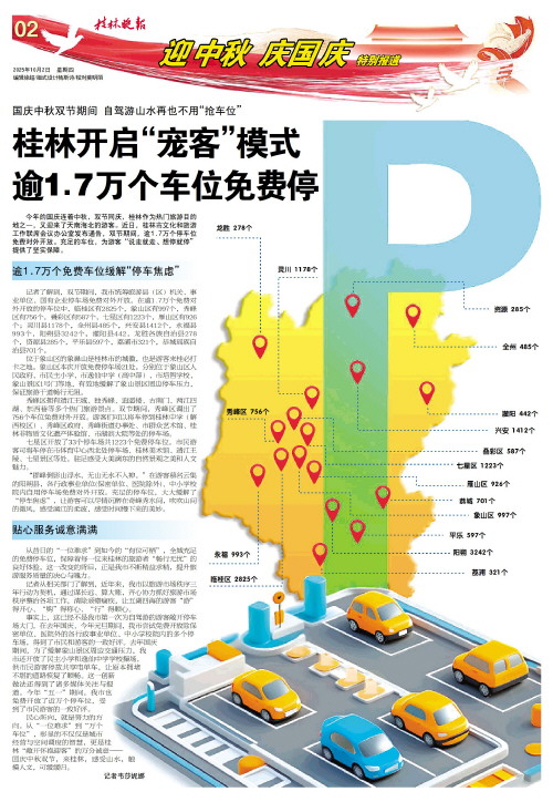 逾1.7万个车位免费停   今年的国庆连着中秋,双节同庆,桂林作为热门旅游目的地之一,又迎来了天南海北的游客。近日,桂林市文化和旅游工作联席会议办公室发布通告,双节期间,逾1.7万个停车位免费对外开放。充足的车位,为游客“说走就走、想停就停”提供了坚实保障。