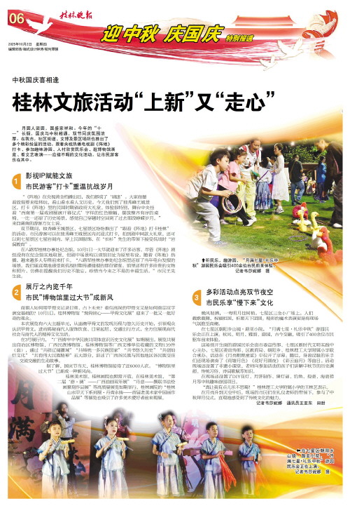 中秋国庆喜相逢 桂林文旅活动“上新”又“走心”   月圆人团圆,国盛家祥和。今年的“十一”长假,国庆与中秋相遇,双节同庆氛围浓厚。在我市,社区街道、文博及景区场所也推出了多个精彩纷呈的活动。跟着央视热播电视剧《阵地》打卡、参加趣味游园、入村欣赏民乐会、逛博物馆展览、看文艺表演……应接不暇的文化活动,让市民游客乐在其中。