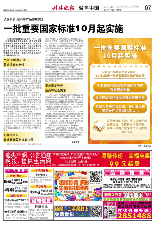 涉及手表、湿巾等产品使用安全 一批重要国家标准10月起实施   记者从市场监管总局了解到,10月1日起一批重要国家标准开始实施。手表外观件强制性新国标将明确有害物质限量,湿巾产品推荐性标准将提高安全性,机器人三维视觉系统、云计算通用要求等有了国家标准……这些标准的实施,将为规范产业健康发展、营造良好消费环境、保障人民群众生命财产安全提供标准支撑。