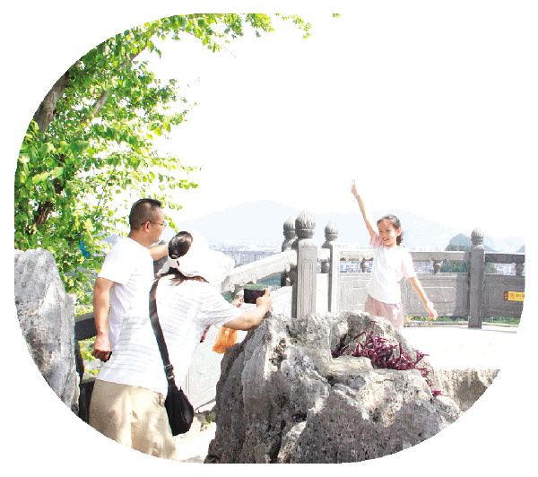 ↑游客在独秀峰顶拍照留念。 记者黄敏 摄