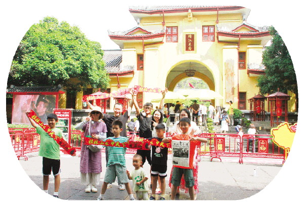 ↑游客在独秀峰王城景区门前手持“桂林山水甲天下发源地”横幅拍照留念。 记者黄敏 摄