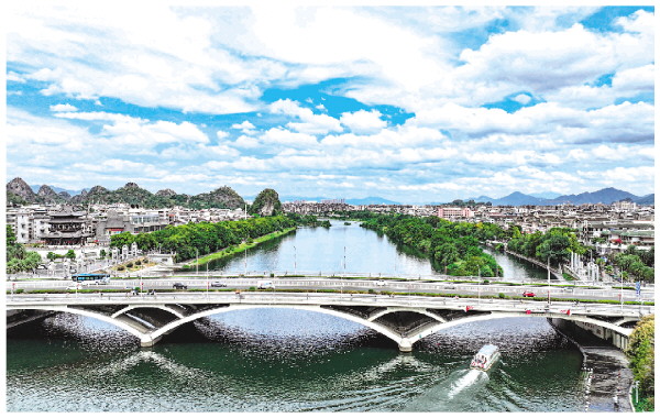 10月6日,一艘游船从解放桥下穿过,此时,远方一望无际的蓝天白云构成了极佳的远景。在蓝天白云的映衬下,漓江风光更加引人入胜。 记者滕嘉 摄