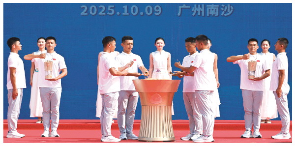 9日,位于广州市南沙区的广州海洋地质调查局科考码头气氛热烈,“梦想”号大洋钻探船就停泊在这里。10时许,火种护卫队将来自1522米深处的海底“源火”安放至“源火”台,采火少女在“源火”台引燃采火棒,国家体育总局、中国残联、广东省委省政府主要负责同志与香港、澳门特别行政区行政长官共同登台,接过采火棒,一起点燃十五运会和残特奥会火种盆,寓意粤港澳三地携手共进、同心筑梦。