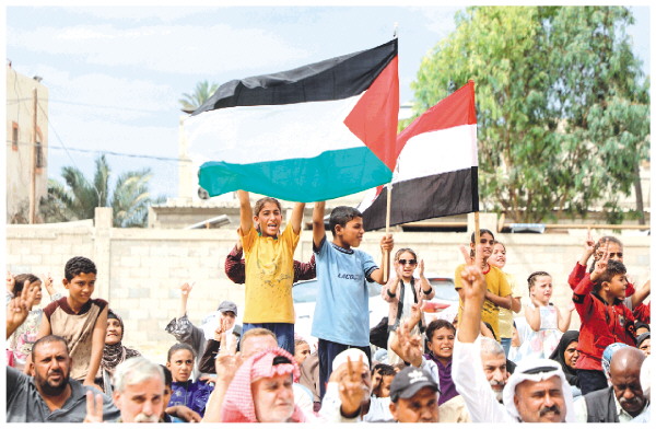10月9日,在加沙地带中部代尔拜拉赫,巴勒斯坦民众在获悉加沙停火协议的消息后庆祝。