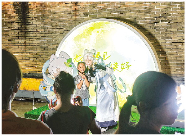 近日,在古南门附近,一名小女孩正在一轮“明月”前与“嫦娥”合影,女孩的脸上充满了喜悦。 记者滕嘉 摄