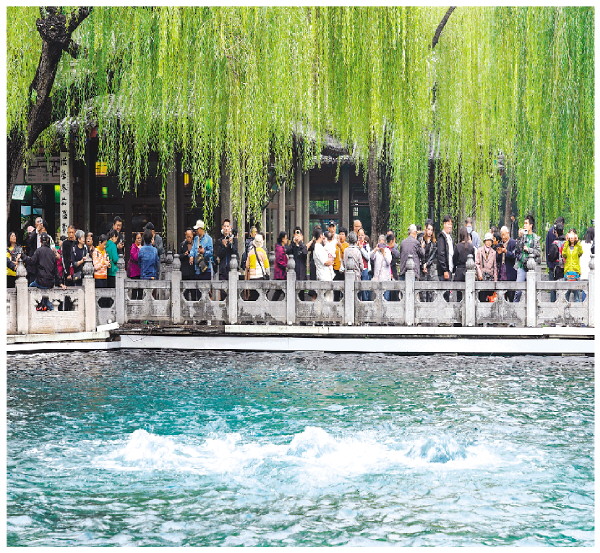 10月15日,游客在济南趵突泉公园观光游览。趵突泉实时水位达到30.32米,刷新1966年以来的最高水位纪录。受近期降雨影响,山东省济南市群泉奔涌,吸引游客前来观赏。新华社发