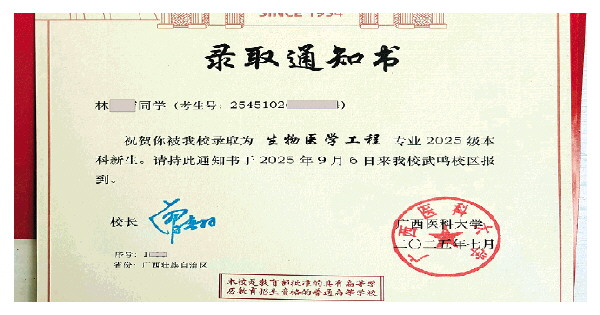 来自百色市那坡县的林同学,是第十二季“福彩情·学子梦”公益助学活动的受助者之一。凭借不懈努力,她在今年高考中成功考入广西医科大学,就读生物医学工程专业。