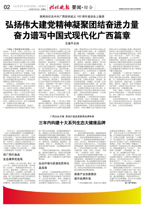 奋力谱写中国式现代化广西篇章 王维平主持   广西云-广西日报10月15日讯(记者陈贻泽 罗昌亮 赵超)10月15日,纪念中共广西组织成立100周年座谈会在梧州举行,深入学习贯彻习近平总书记关于党的建设的重要思想和党的自我革命的重要思想,贯彻落实习近平总书记在庆祝中国共产党成立100周年大会上的重要讲话精神和关于广西工作论述的重要要求,回顾广西党组织百年发展历程,弘扬伟大建党精神,凝聚新时代新征程团结奋进力量,以史为鉴、开创未来,奋力谱写中国式现代化广西篇章,为强国建设、民族复兴伟业作出新的更大贡献。自治区党委书记、自治区人大常委会主任陈刚出席会议并讲话。自治区党委副书记王维平主持会议。