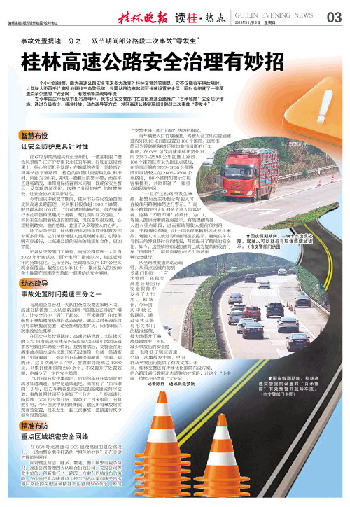 事故处置提速三分之一 双节期间部分路段二次事故“零发生” 桂林高速公路安全治理有妙招   一个小小的锥筒,能为高速公路安全带来多大改变?桂林交警的答案是:它不仅能在车辆故障时,让驾驶人不再手忙脚乱地翻找三角警示牌,只需从路边拿起即可快速设置安全区;同时也织就了一张覆盖百余公里的“安全网”,有效预警并疏导车流。