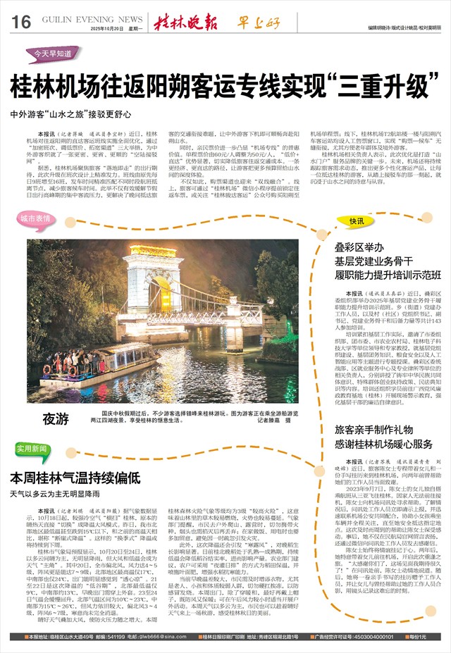 桂林机场往返阳朔客运专线实现“三重升级” 中外游客“山水之旅”接驳更舒心   本报讯(记者蒋璇 通讯员李宜轩)近日,桂林机场对往返阳朔的直达客运班线实施全面优化,通过“加密班次、调低票价、拓宽渠道”三大举措,为中外游客织就了一张更密、更省、更顺的“空陆接驳网”。