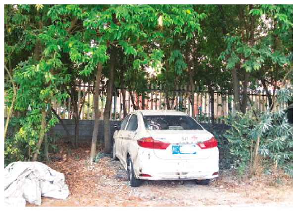 合心苑小区围墙外的树林内发生汽车自燃险情,小区保洁员发现情况后立即上报。(空明社区供图)