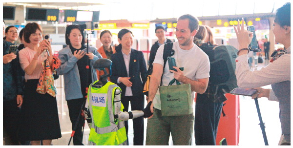 近日,桂林机场在T2航站楼举办“遇见未来·桂林机场AI奇遇记”主题活动。活动中,身穿桂林机场马甲的机器人与一名外国旅客友好握手,“科技+航旅”的新体验为旅客们带来了笑容。 通讯员阳艳 摄