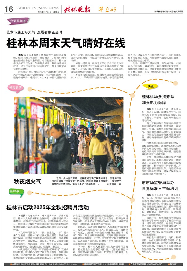 此外,近期天气湿度较低,空气偏干燥,市民在外出逛市集、看演出时,要记得及时补充水分,既能保持身体舒适,也能更好地享受桂林秋日独有的干爽与惬意,在文化熏陶与自然美景中度过一个充实的周末。