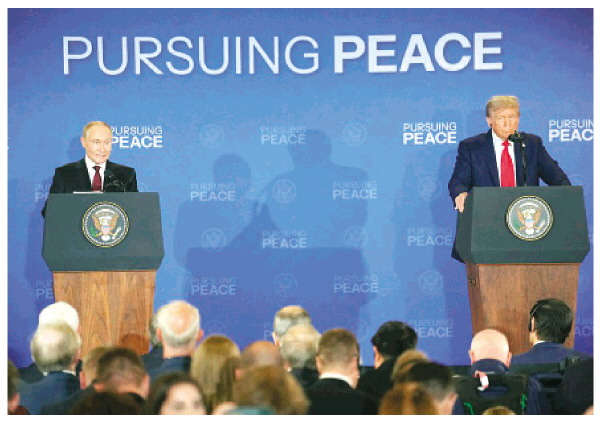 8月15日,美国总统特朗普(右)与俄罗斯总统普京在美国阿拉斯加州安克雷奇市埃尔门多夫-理查森联合军事基地举行会晤后共同出席联合记者会。