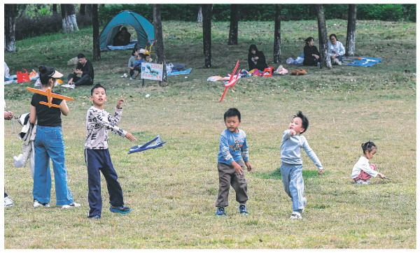 近日在临桂区山水公园草坪上,几个小朋友一起比赛放飞机,享受天真的童年时光。记者滕嘉 摄