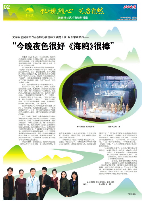 文学巨匠契诃夫作品《海鸥》在桂林大剧院上演 观众掌声热烈—— “今晚夜色很好 《海鸥》很棒”   本报讯(记者周文琼)10月28日晚,契诃夫经典话剧《海鸥》在桂林大剧院上演。在秋意渐浓的桂林夜晚,这部气质高雅的作品与城市的文化氛围相得益彰,为观众带来一场关于文学、戏剧与人性的深度对话。