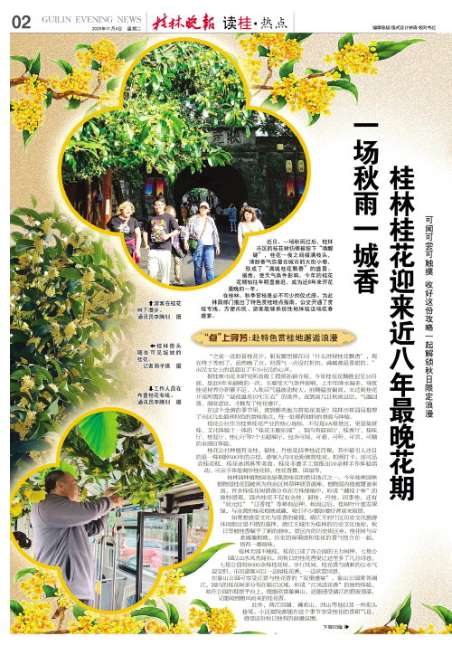 在桂林,秋季赏桂是必不可少的仪式感。为此林园部门推出了特色赏桂地点指南,公交开通了赏桂专线,方便市民、游客能够系统性地体验这场花香盛宴。