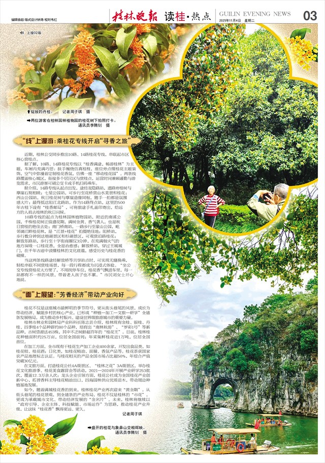 近期,桂林公交同步推出10路、14路桂花专线,串联起市区核心赏桂点。