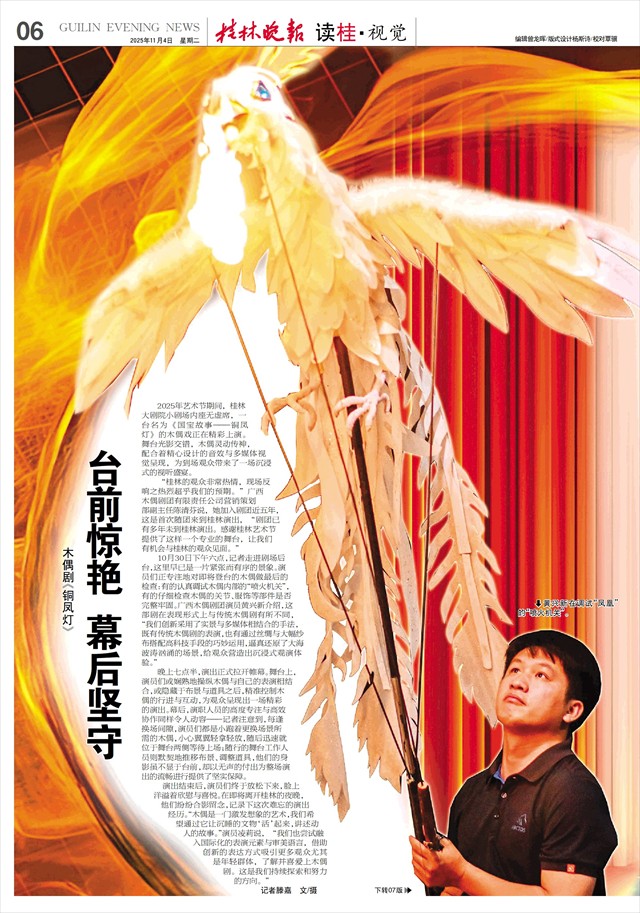 2025年艺术节期间,桂林大剧院小剧场内座无虚席,一台名为《国宝故事——铜凤灯》的木偶戏正在精彩上演。舞台光影交错,木偶灵动传神,配合着精心设计的音效与多媒体视觉呈现,为到场观众带来了一场沉浸式的视听盛宴。