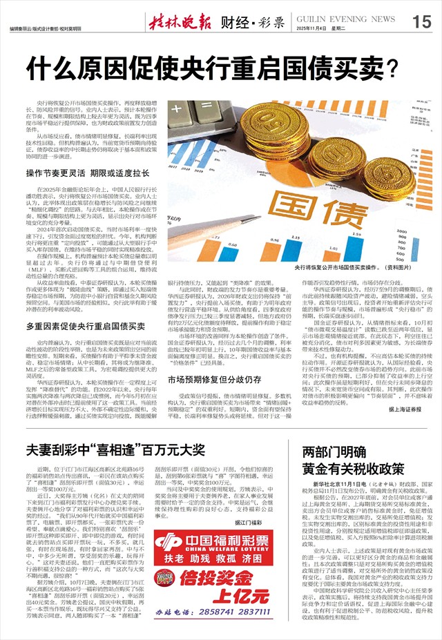 央行将恢复公开市场国债买卖操作,再度释放稳增长、防风险并重的信号。业内人士表示,预计本轮操作在节奏、规模和期限结构上较去年更为灵活,既为四季度市场平稳运行提供保障,也为财政政策前置发力创造条件。