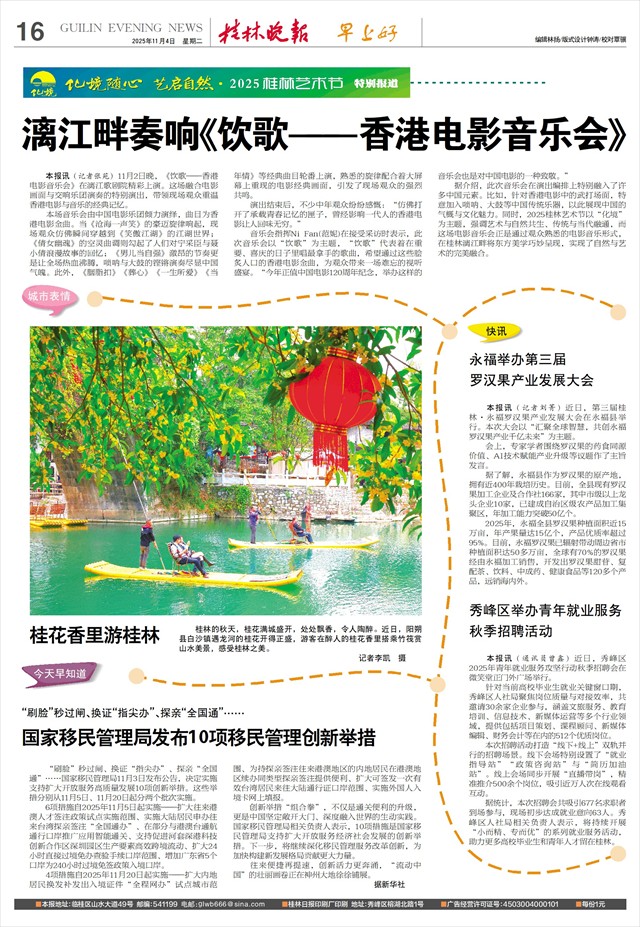 漓江畔奏响《饮歌——香港电影音乐会》   本报讯(记者张苑)11月2日晚,《饮歌——香港电影音乐会》在漓江歌剧院精彩上演。这场融合电影画面与交响乐团演奏的特别演出,带领现场观众重温香港电影与音乐的经典记忆。