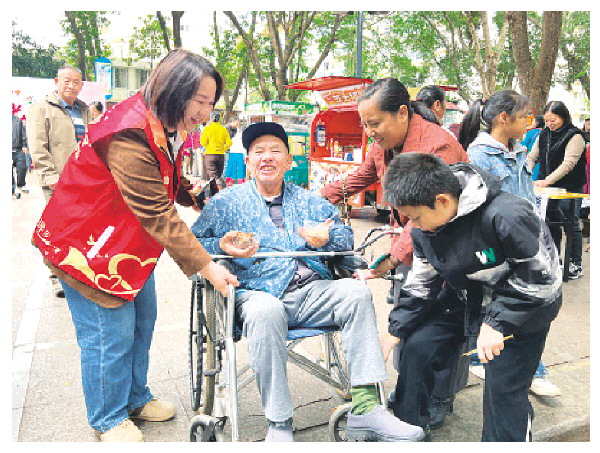 美食节现场,志愿者帮助坐轮椅的居民下台阶。