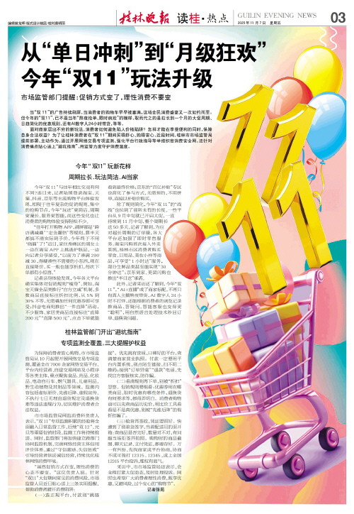 面对商家层出不穷的新玩法,消费者如何避免陷入价格陷阱?怎样才能在享受便利的同时,保障自身合法权益?为了让桂林消费者在“双11”期间买得舒心、购得安心,近段时间,桂林市市场监管局提前部署、主动作为,通过开展网络交易专项监测、强化平台行政指导等举措织密消费安全网,还针对消费痛点贴心送上“避坑指南”,用监管力度守护消费温度。