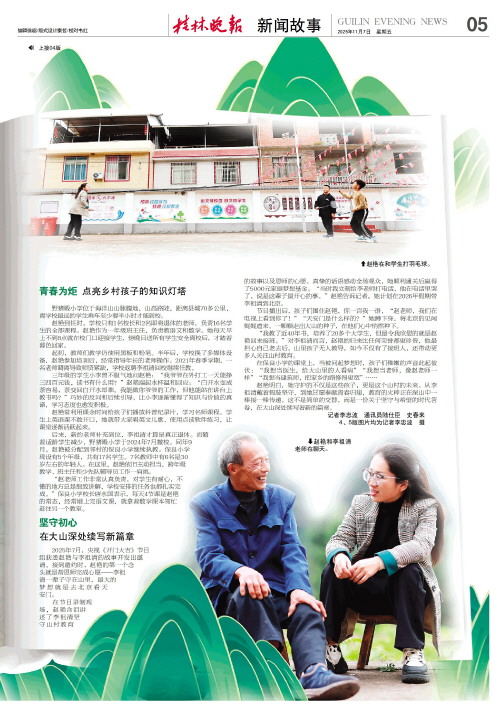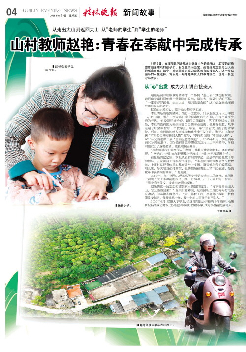 11月6日,在灌阳县洞井瑶族乡保良小学的操场上,27岁的赵艳望着追逐嬉戏的孩子们,目光温柔而坚定。她曾经是立志走出大山的瑶家女孩;如今,她返回家乡成为山区教育的接班人。这一看似循环的人生选择,背后是一场跨越两代人的教育接力,也是一份坚守与传承。