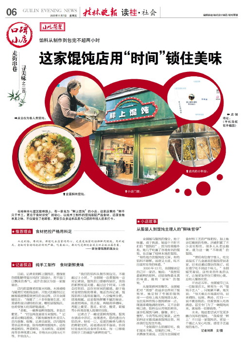 在桂林市七星区毅峰路上,有一家名为“鲜上馄饨”的小店。这家店秉持“鲜不只于手工,更在于食材讲究”的初心,以纯手工制作的馄饨搭配严选食材,还原食物本真之味,不仅留住了老顾客,更吸引众多追求品质与口感的年轻人前来打卡。