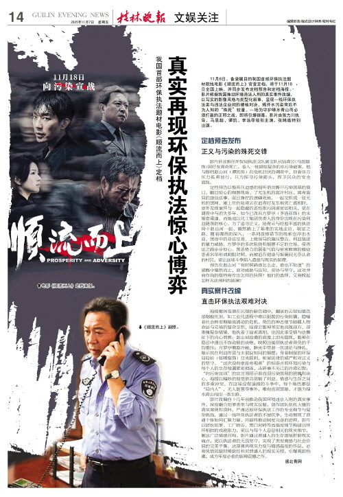 11月6日,备受瞩目的我国首部环保执法题材院线电影《顺流而上》官宣定档,将于11月18日全国上映,并同步发布定档预告和定档海报。影片根据我国推动环境违法入刑的真实事件改编,以写实的影像风格与类型化叙事,呈现一线环保执法者与违法企业间的硬核对决,揭开水污染背后不为人知的“殊死”较量。一场为守护绿水青山而必须打赢的正邪之战,即将引爆银幕。影片由张力川执导,马思超、谭凯、李浩菲领衔主演,张晞临特别出演。