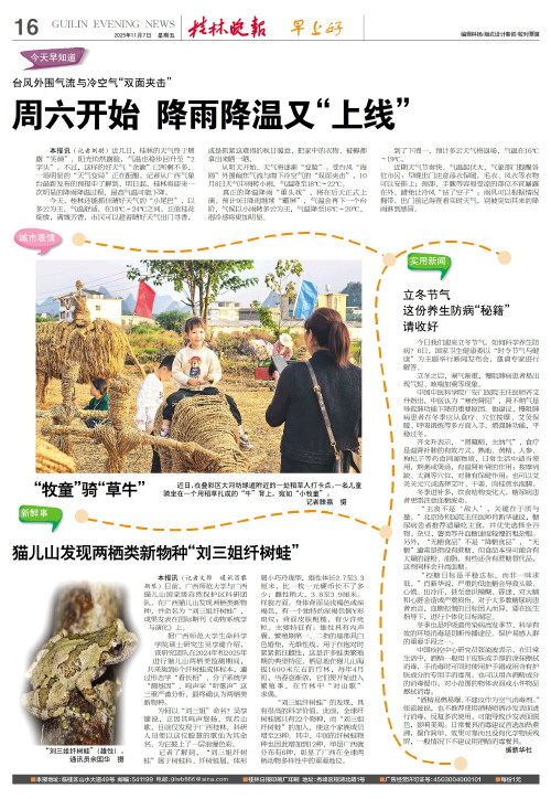 本报讯(记者文烨 通讯员黎斯琴)日前,广西师范大学与广西猫儿山国家级自然保护区科研团队,在广西猫儿山发现两栖类新物种,并命名为“刘三姐纤树蛙”,成果发表在国际期刊《动物系统学与演化》上。