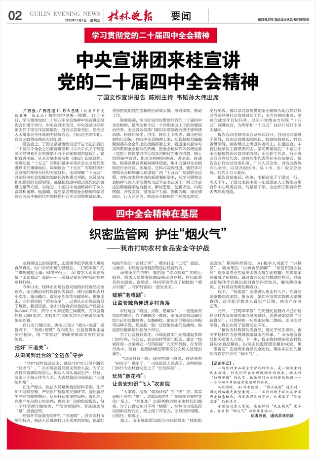 陈刚强调,学习好宣传好贯彻好党的二十届四中全会精神,是当前和今后一个时期全区上下的首要政治任务。全区各地各部门要切实增强政治责任感和使命感,持续在深化、内化、转化上下功夫,真正把思想和行动统一到四中全会精神上来,把智慧和力量凝聚到落实全会作出的战略部署上来。要迅速兴起学习宣传贯彻全会精神的热潮,把全会精神作为各级党委(党组)理论学习中心组学习研讨的重点内容,精心组织集中宣讲,把全会精神讲准确、讲全面、讲透彻,统筹各级各类新闻媒体资源,集中力量对全会精神进行全方位、多角度、立体式宣传报道。要把学习贯彻全会精神融入到谋划广西“十五五”发展的全过程,对标对表党中央的新部署新要求,把学习贯彻全会精神与深入学习贯彻习近平总书记关于广西工作论述的重要要求结合起来,解放思想、创新求变,向海图强、开放发展,坚持实干为要、创新为魂,用业绩说话、让人民评价,推动全会精神在广西落地落实、见行见效。要以学习宣传贯彻全会精神为动力抓好我区当前经济社会发展各项工作,全力冲刺四季度,坚决完成全年目标任务,以实干实绩奋力实现“十四五”圆满收官,为明年和“十五五”良好开局打下坚实基础。