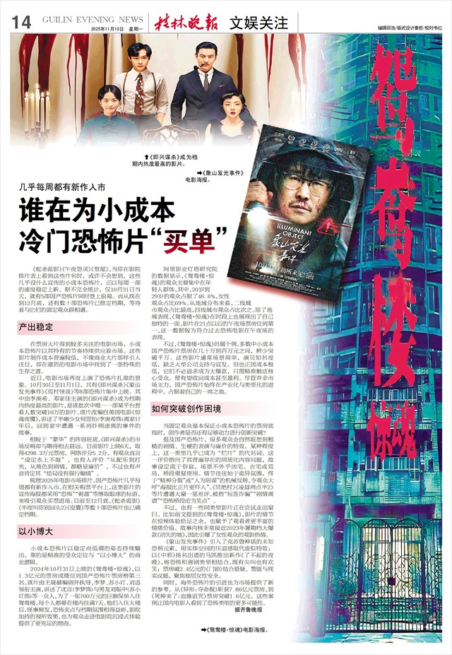 冷门恐怖片“买单”   《蛇杀诡影》《午夜怨灵》《祭屋》,当你在影院排片表上看到这些片名时,或许不会想到,这些几乎没什么宣传的小成本恐怖片,正以每周一部的速度稳定上新。据不完全统计,仅10月31日当天,就有5部国产恐怖片同时登上银幕。而从现在到12月底,还有数十部恐怖片已排定档期,等待着与它们的固定观众群相遇。