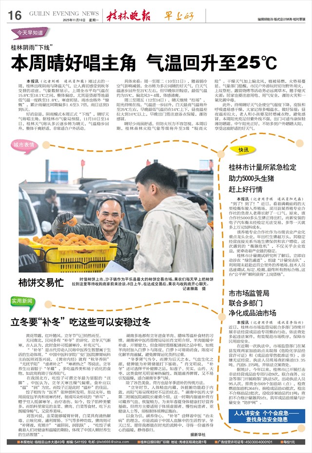 桂林阴雨“下线” 本周晴好唱主角 气温回升至25℃   本报讯(记者刘琪 通讯员阳薇)刚过去的一周,桂林出现阴雨与降温天气,让人真切感受到秋冬交替的凉意。气象数据显示,上周全市平均气温在15.8℃至18.1℃之间,整体偏凉,尤其是资源等地最低气温一度跌至11.8℃,寒意初显。雨水也格外“慷慨”,累计雨量比同期偏多1.6至3.7倍,雨日达到3到5天。