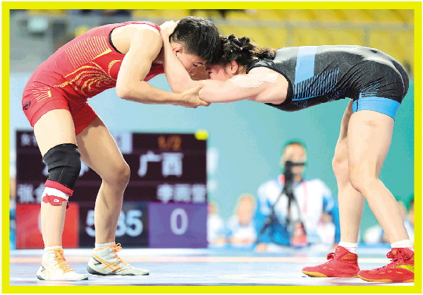 11月10日,第十五届全国运动会摔跤女子自由式53公斤级半决赛在广东清远举行。图为来自桂林灵川县的选手李雨萱(右)与江苏队选手张金在比赛中。 新华社发