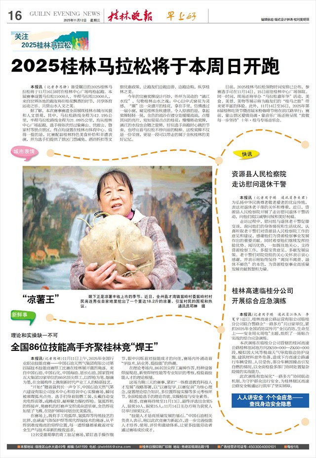 2025桂林马拉松将于本周日开跑   本报讯(记者李思静)备受瞩目的2025桂林马拉松将于11月16日8时在桂林中心广场鸣枪起跑。本届赛事设置马拉松11000人、半程马拉松12000人,来自世界各地的跑友将在桂花飘香的时节,共享体育运动之乐、共赏山水人文之美。
