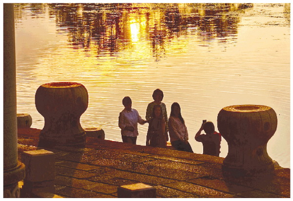 近日,在南洲大桥附近的漓江水域,江面波光粼粼,倒映着金色的夕阳,几名市民在这里用手机记录这秋日的美好。