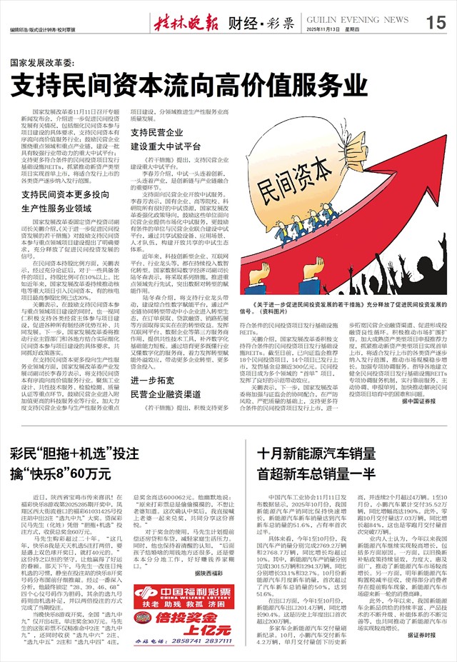 国家发展改革委11月11日召开专题新闻发布会,介绍进一步促进民间投资发展有关情况,包括细化民间资本参与项目建设的具体要求,支持民间资本有序流向高价值服务行业;鼓励民营企业围绕重点领域和重点产业链,建设一批具有较强行业带动力的重大中试平台;支持更多符合条件的民间投资项目发行基础设施REITs,抓紧推动新资产类型项目实现首单上市,将适合发行上市的各类资产逐步纳入发行范围。