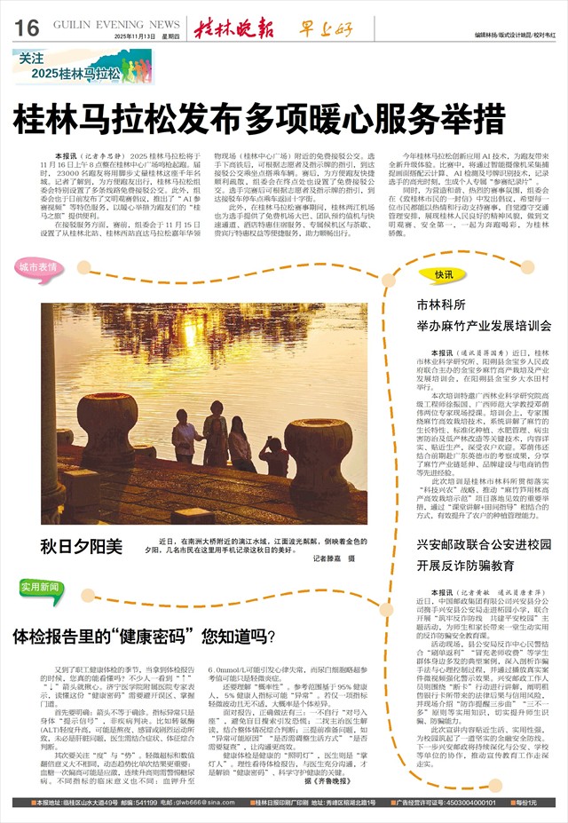 桂林马拉松发布多项暖心服务举措   本报讯(记者李思静)2025桂林马拉松将于11月16日上午8点整在桂林中心广场鸣枪起跑。届时,23000名跑友将用脚步丈量桂林这座千年名城。记者了解到,为方便跑友出行,桂林马拉松组委会特别设置了多条线路免费接驳公交。此外,组委会也于日前发布了文明观赛倡议,推出了“AI参赛视频”等特色服务,以暖心举措为跑友们的“桂马之旅”提供便利。