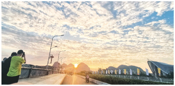 16日清晨,金色的晨曦倾泻在解放桥上,一些市民游客被此处的美景所吸引,举起手机记录下这美好时刻。