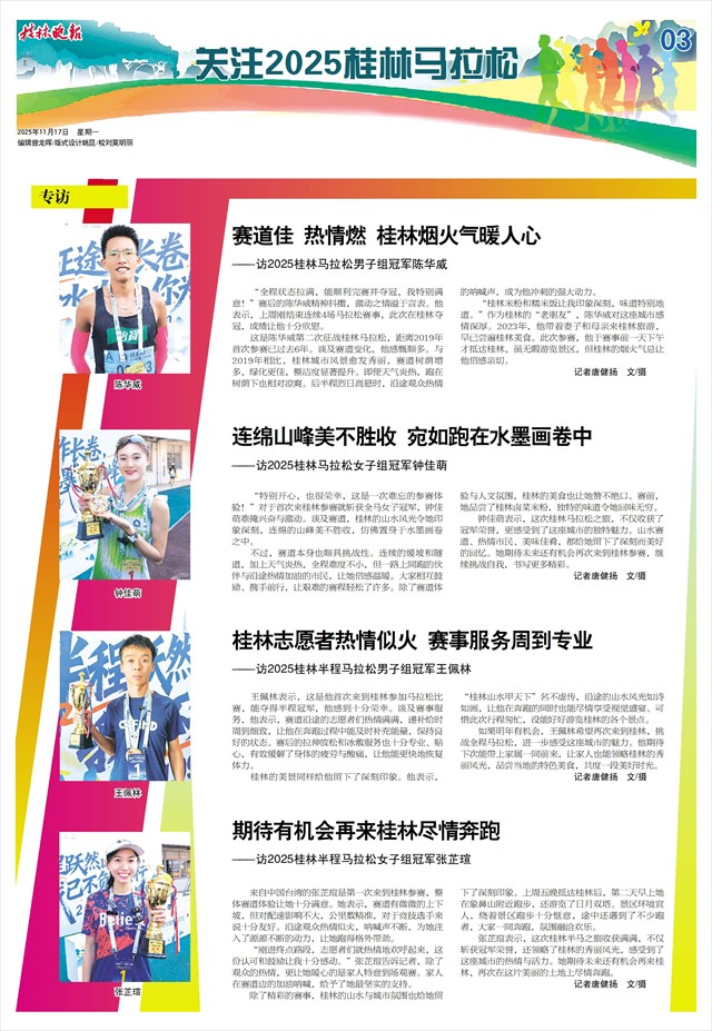 “全程状态拉满,能顺利完赛并夺冠,我特别满意!”赛后的陈华威精神抖擞,激动之情溢于言表。他表示,上周刚结束连续4场马拉松赛事,此次在桂林夺冠,成绩让他十分欣慰。