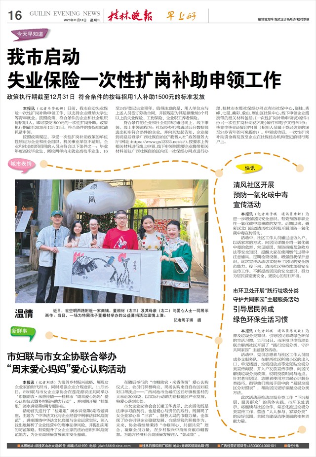 “周末爱心妈妈”爱心认购活动   本报讯(记者刘琪)为服务乡村振兴战略,展现女企业家的时代担当,同时增强企业合规意识,11月15日,市妇联与市女企业家协会在莲花源农庄共同举办“巾帼助农·米香传情——桂林市‘周末爱心妈妈’爱心认购仪式暨乡村振兴助力行动”,并同期开展“桂姐姐”漓水讲堂第8期专题讲座。