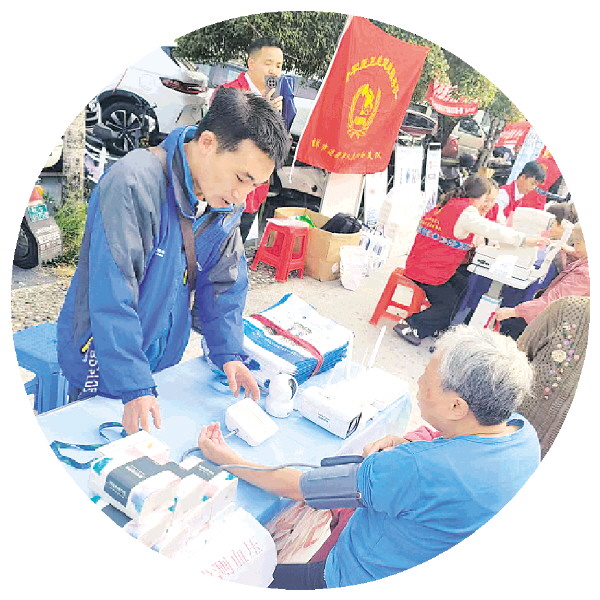 在桂大社区,中国移动桂林分公司工作人员为居民测量血压。