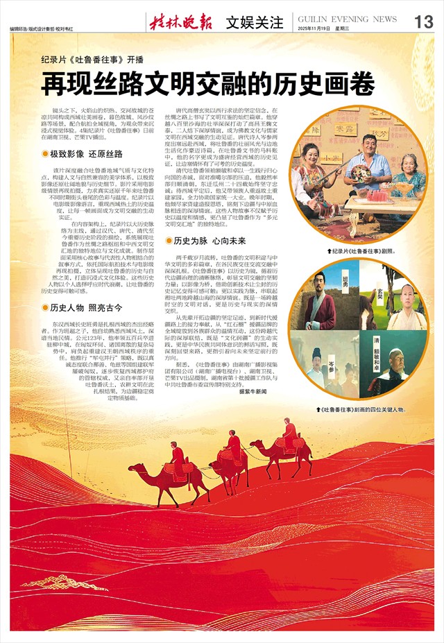 纪录片《吐鲁番往事》开播 再现丝路文明交融的历史画卷   镜头之下,火焰山的炽热、交河故城的苍凉共同构成西域壮美画卷,暮色故城、风沙纹路等场景,配合航拍全域视角,为观众带来沉浸式视觉体验。4集纪录片《吐鲁番往事》日前在湖南卫视、芒果TV播出。